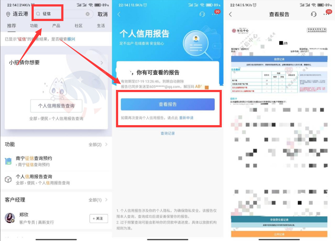 2、首页搜索:征信 点击个人信用报告查询, 验证信息后24小时内会给你报告。 可以去查查自己的信用是否有问题,有无逾期问题。 成功后会给你消息通知的, 在消息代办里面即可看到报告, 查询的信息还是比较准确的,征信没问题的话 以后就可以贷款买车买房了,有问题就不行哦!建议都去查一下!